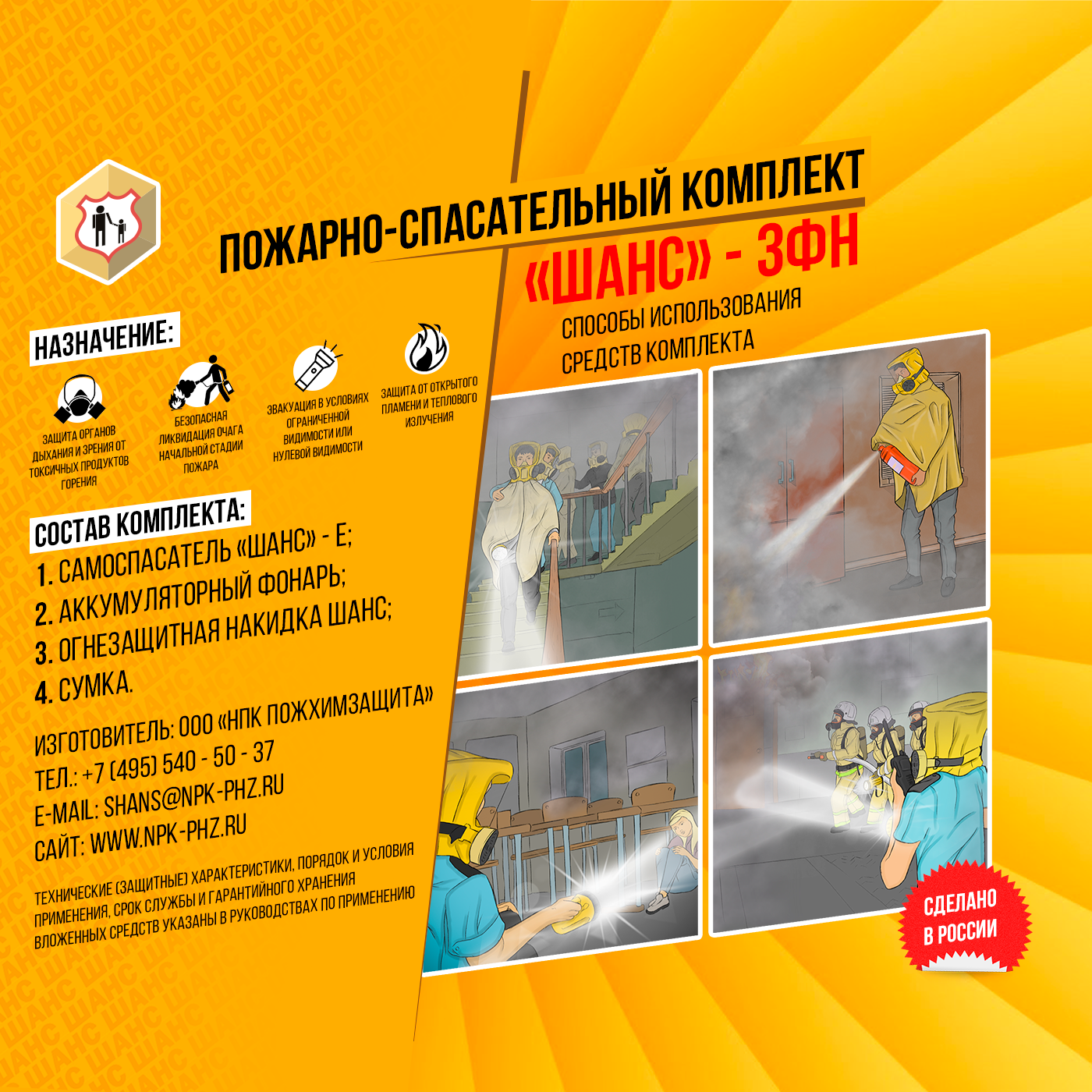 аккумуляторный фонарь для освещения путей эвакуации в условиях ограниченной видимости, накидка "Шанс" для предотвращения возгорания одежды, защиты от открытого пламени, теплового излучения и изоляции очага возгорания от окружающего воздуха.